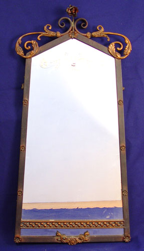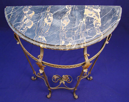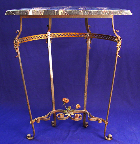 VINTAGE DECO ERA WROUGHT IRON DEMI TABLE AND MIRROR: Ca. 1920's. Wrought iron demi table fitted with a black marble top, 31''h. x 25'' x 10''. Matching mirror, 31'' x 16''. Both have remains of a polychrome finish.