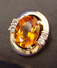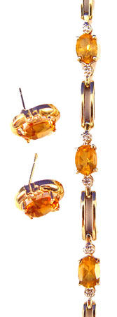 ESTATE CITRINE AND DIAMOND BRACELET AND EARRINGS: 1) 14K gold bracelet set with 5.25 CTW citrine and .15 CTW diamonds. Citrines are rated VVS in clarity (Type I), OY (orangey yellow) in Hue, 2-3 in Tone and 2 in Saturation. The diamonds are round single cut, rated SI in clarity and I-J in color. The gemstones are prong set. Locking closure with figure eight safety clasp. Weight: 8.6 grams. 7'' in length. 2) 2.50 CTW CITRINE AND .15 CTW DIAMOND EARRINGS, 14K yellow gold earrings with oval shaped mixed cut citrine, rated VVS in clarity (Type I), YO (yellowish orange) in Hue, 3 in Tone and 2-3 in Saturation. Diamonds are rated SI in clarity and I-J in color. The gemstones are prong set. Post and nut closures (nuts are missing) Weight: 2.9 grams. Approx. .5'' in length.