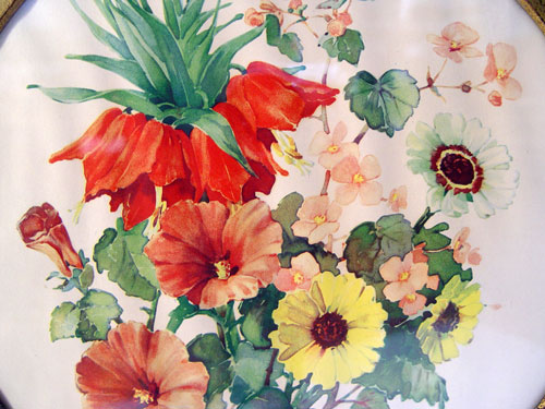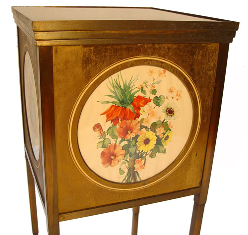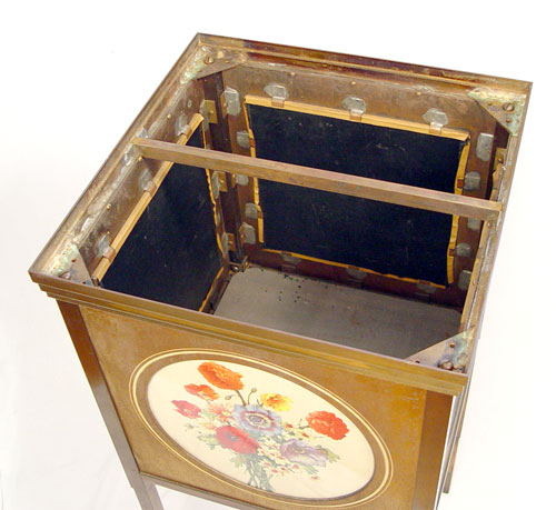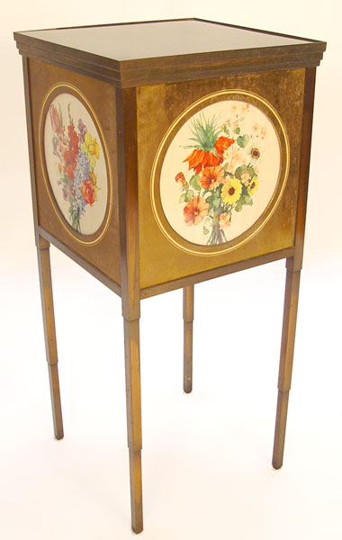 CUSTOM MADE LAMP STAND WITH HIDDEN COMPARTMENT: Hidden compartment under top. Metal legs with wood sides & top. Percy King 1940 decorative floral prints on all 4 sides. 39 3/4'' high X 17 1/2'' square.