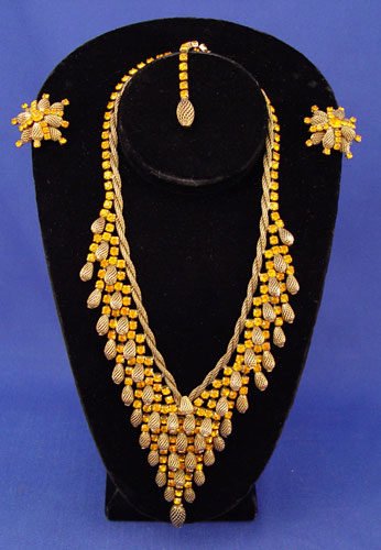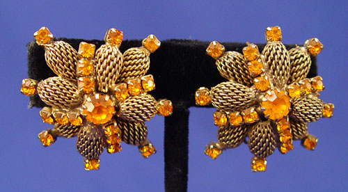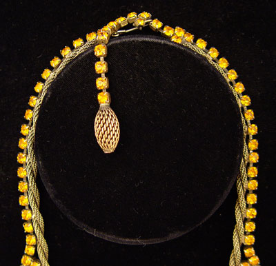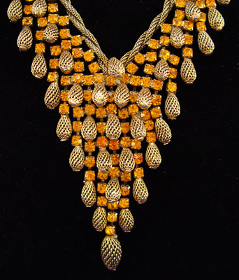 SIGNED SCHIAPARELLI NECKLACE & EARRINGS: Tangerine rhinestones and mesh metal oval globes dangle from a double mesh twisted chain. Approx. 18''l, the V at the center hangs 3.5 ''. Matching clip earrings are 1.5'' dia. Signed in the oval plaque on earring and necklace. Wow factor from Elsa Schiaparelli.