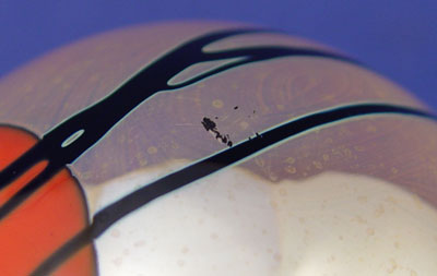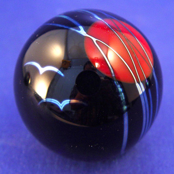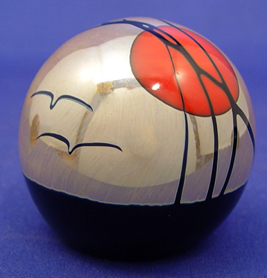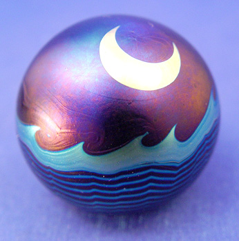 3 SIGNED CORREIA GLASS PAPERWEIGHTS: 1) 3'' diameter with red sun, black veining and seagulls over pearlized background. Signed and numbered 5-6-77-9. Note tiny flake area on top. 2) 2 3/8'' diameter with red sun, silver/blue veining and seagulls over black background. Signed and numbered WSSSU-8-84-9. 3) 2 1/8'' diameter blue wave and silver crescent moon design over purple background. Signed and numbered MSCIM-43-80-11.
