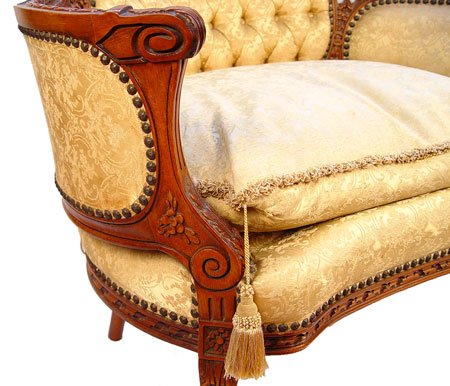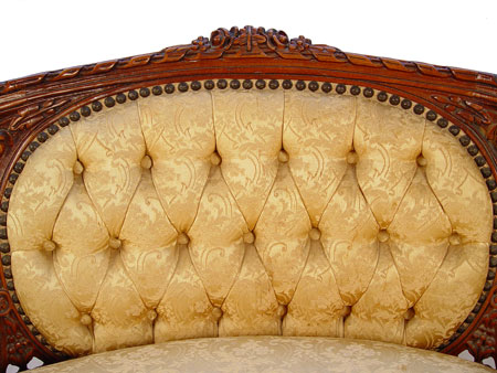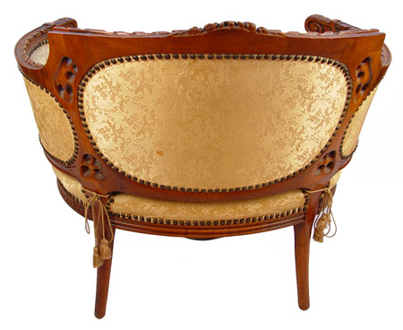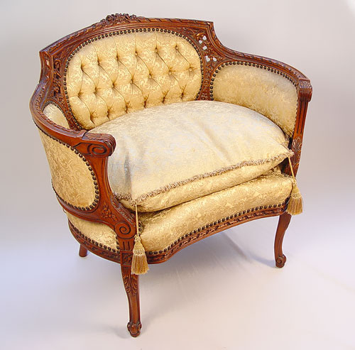 FRENCH CARVED PARLOR CHAIR: Curved wrap around form, tufted back, down cushion with fringe. All original fabric. 32 1/4'' h x 35 1/8'' x 27'' deep.