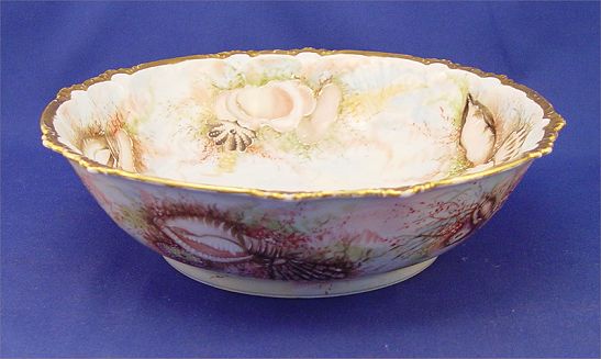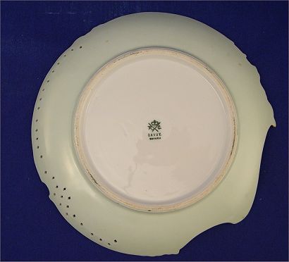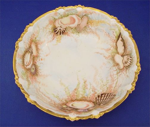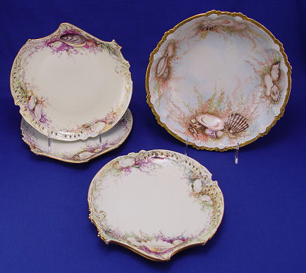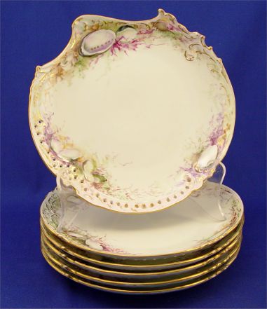 ROSENTHAL HAND PAINTED OYSTER DECORATED CHINA: Master bowl hand painted in an oyster motif, the 6 asymmetrical reticulated plates are painted in a complimentary oyster design, 8'' dia. Gold enhancements. All bear the Rosenthal backstamp.