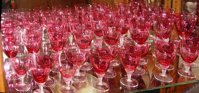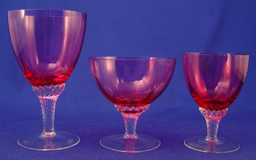 TWIST STEM CRANBERRY GLASS STEMWARE: 27 pieces to include 16 water goblets (6 1/4'' high), 6 wine stems (4 1/4''), and 5 champagne / sherberts (4 1/8'').