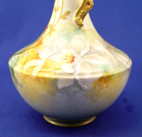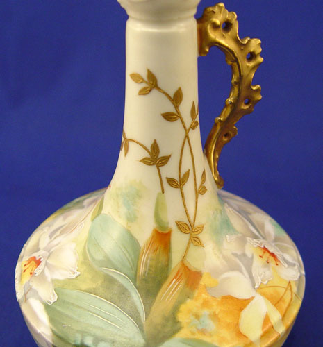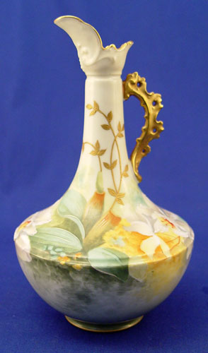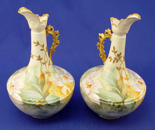 PAIR OF HAND PAINTED FRENCH LIMOGES EWERS: Lanternier, Ca. 1891-1914 Floral and fern design, pierced gilt handles, 8''h.