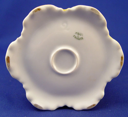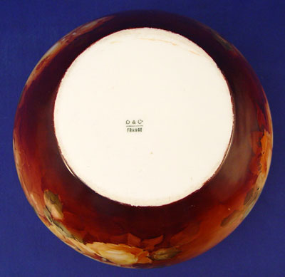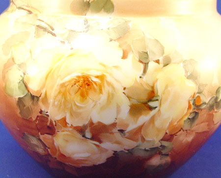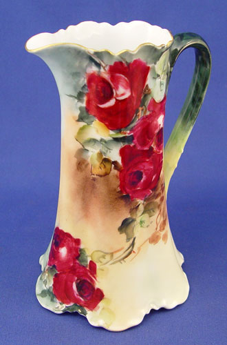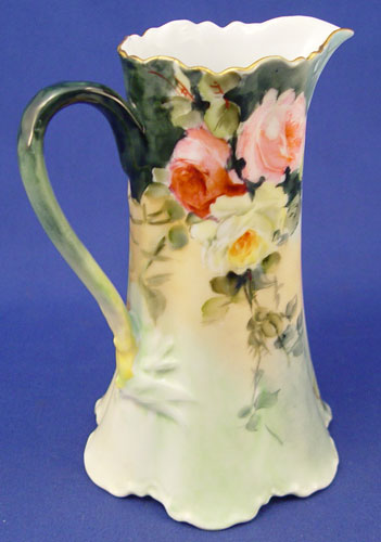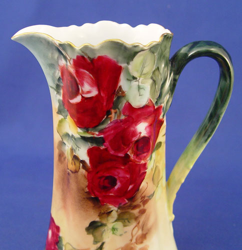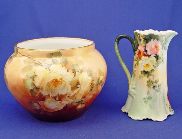 ROSE DECORATED FRENCH LIMOGES JARDINIERE AND PITCHER: 1) Yellow rose jardiniere, Remy Delinieres, Ca. 1894-1900. Approx. 6 1/2''h., 9 1/2''dia., 7'' rim. 2) Burgundy and pink rose pitcher marked M&C CO. L France and an impressed 2, 7 1/2''h.