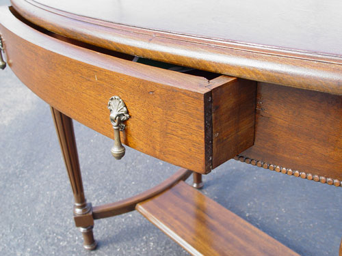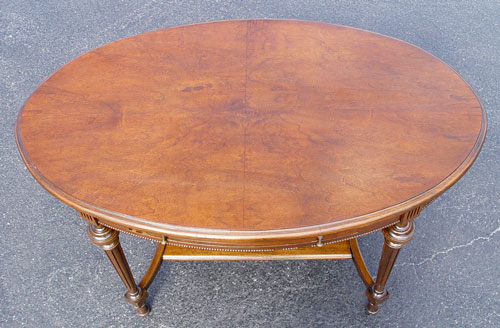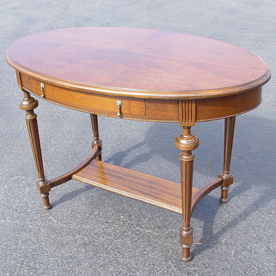 EARLY 20TH C WALNUT OVAL PARLOR TABLE: Ca. 1920's. One drawer, bead trim, turned trumpet legs. 45'' long x 29 1/2'' high x 25'' wide. Refinished condition.