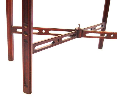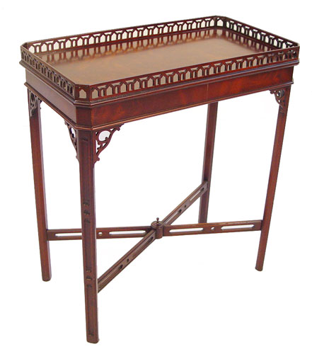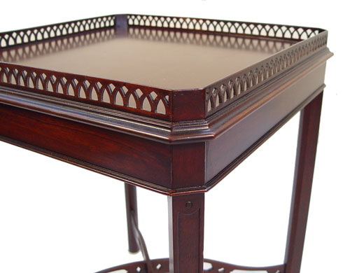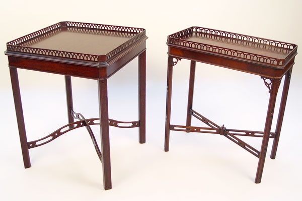 TWO MAHOGANY CHINESE CHIPPENDALE STYLE SIDE TABLES: Featuring pierced gallery, canted corners and cross stretchers. Each a bit different from other. 28''h x 14'' x 25'' and 28''h x 22'' x 22''h. Please note some loose gallery to each.