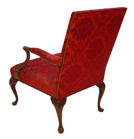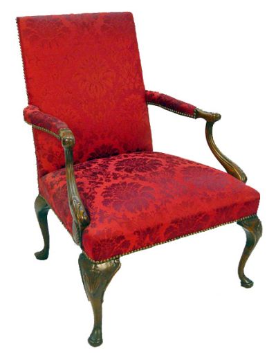 CARVED MAHOGANY OPEN ARM CHAIR: Carved hand holds and supports, carved cabriolet legs. 37'' high x 29'' wide x 30'' deep