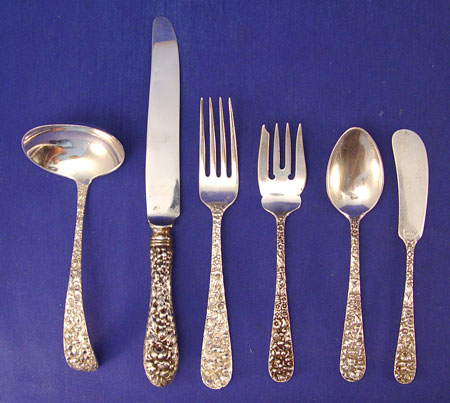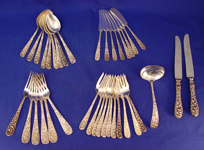 STIEFF ROSE STERLING FLATWARE: 37 pieces to include 6 dinner forks (6 7/8''), 11 salad forks, 9 teaspoons, 8 butter knives, 2 dinner knives (8 7/8'') and a gravy ladle. Approx. 44 troy oz. Marked Steiff Sterling.