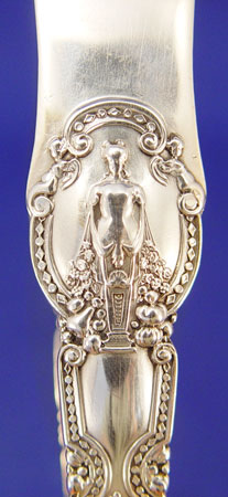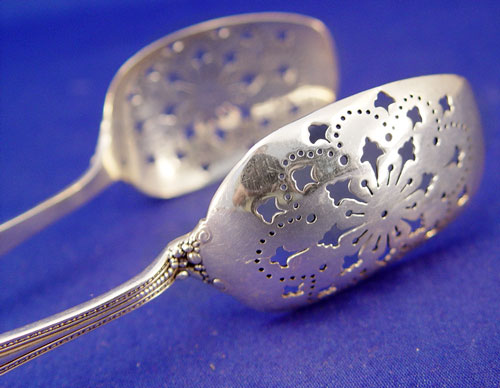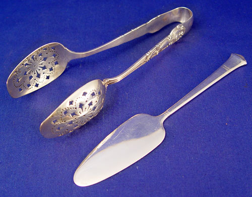 TIFFANY STERLING TONGS AND CHEESE SERVER: Large ice tongs Renaissance pattern marked ''Tiffany & Co. Sterling Pat. 1905m''. Cheese server Windham pattern marked ''Tiffany & Co. Sterling Pat 1923m''. Both are approx. 7'' long. Approx. 4.3 troy oz. Approx. 4.3 troy oz.