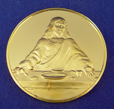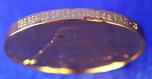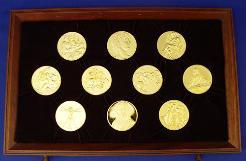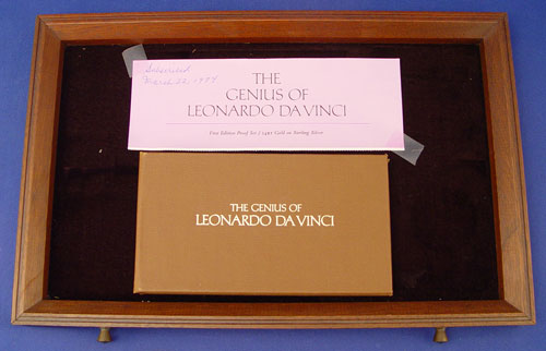 STERLING FRANKLIN MINT LEONARDO DA VINCI COIN SET IN CASE: 24K gold electroplate over sterling. First Edition proof set ''The Genius of Leonardo Da Vinci''. 50 coins depicting various works of Da Vinci with COA's and description of each accompanying wood case measures 9 3/4'' high across X 11 3/4'' deep. Approx 106.25 troy oz.