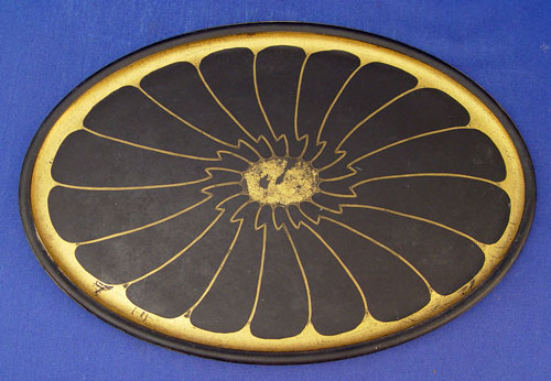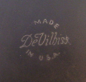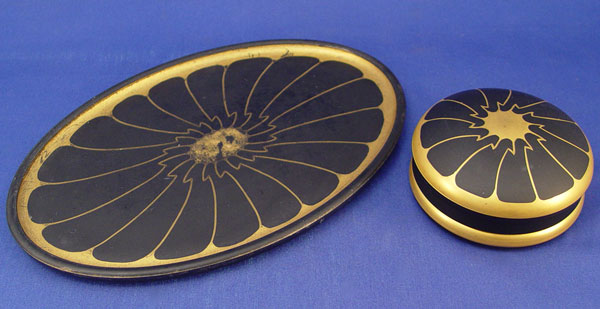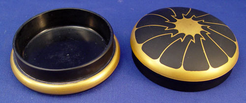 DEVILBISS ART DECO GLASS DRESSER JAR & TRAY: Gold on black glass. the tray is 10 1/2'' oval, some wear to gold. Jar is 4 1/2'' dia, 2'' high. Jar signed ''DeVilbiss Made in USA''