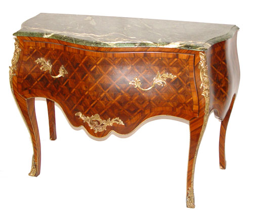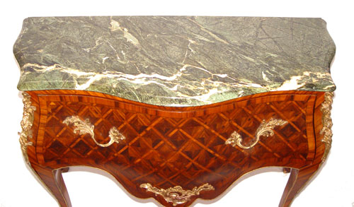 FRENCH STYLE GREEN MARBLE TOP PARQUETRY INLAY COMMODE: Deep single drawer, ormolu mounts, 35'' high x 48'' wide x 21'' deep. Made in Egypt.