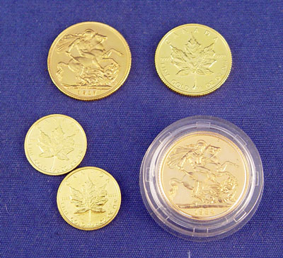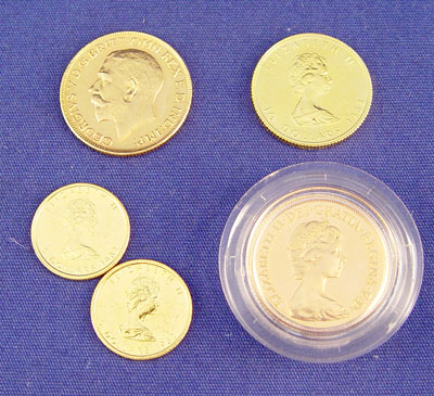 LOT OF 5 GOLD CANADIAN COINS REX, $10, $5: To include 1917 Rex, 1982 $10, 2 1982 $5, 1984 Elizabeth. Approx. 1 troy oz. total weight.