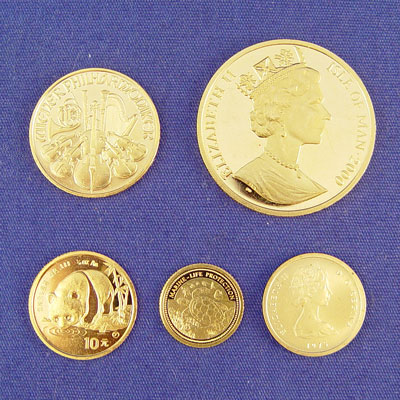 LOT OF 5 ASSORTED GOLD COINS CHINA, ISLE OF MAN: To include 1975 Turks & Caicos 25 gold crown; 2000 Isle of Man 1/2 oz. crown; 1998 Austrian 500 shillings; 1987 10 yaun, 1998 Palau $1. Approx. 1 troy oz.