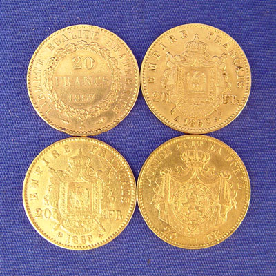 LOT OF 4 FRENCH GOLD 20 FRANCS: To include 1897 angel, 1862, 1867, 1869. Approx. .75 troy oz.