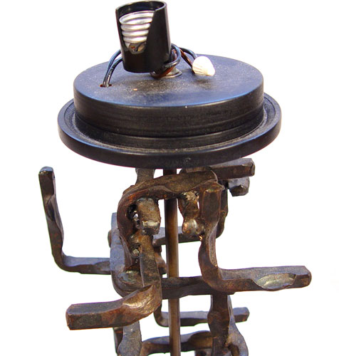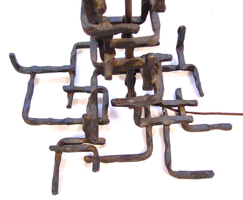 ITALIAN FANTONI RAYMOR SCULPTED METAL TABLE LAMP: Geometric modern sculpted metal lamp marked with metal tag '' Fantoni Firenze Italy Raymor ''. 26'' high to top of socket X 17 1/2'' x 16 1/2'' base.