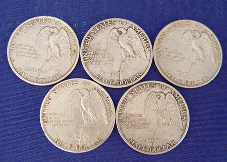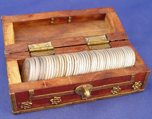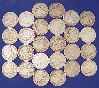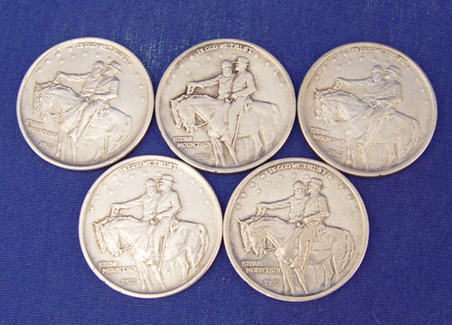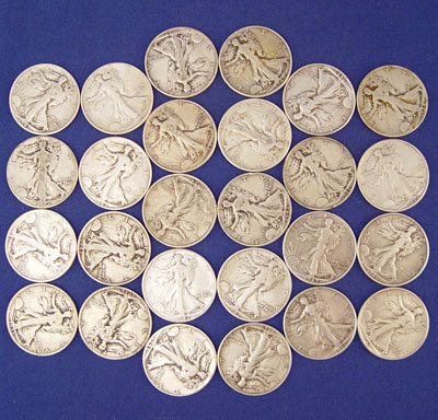 45 HALF DOLLARS 1925, LIBERTY, FRANKLIN, KENNEDY: To include 5 1925 Stone Mountain memorial, 26 walking liberty, 1 Ben Franklin, 9 1964 Kennedy, 4 clad Kennedy. Approx. 16.25 troy oz. total weight without clads. Lot comes in wooden box with brass decoration.