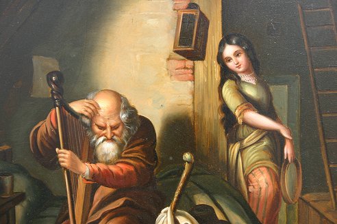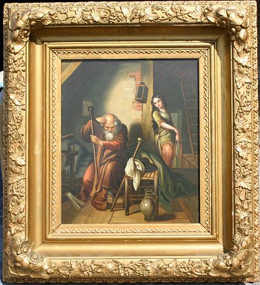 INTERIOR GENRE SCENE OIL ON TIN: Older Man playing a harp and young girl a tambourine, 10'' x 8 1/2'', no visible signature, 19th C embossed and gilded frame with wear and over-paint, 16 1/4'' x 15''.