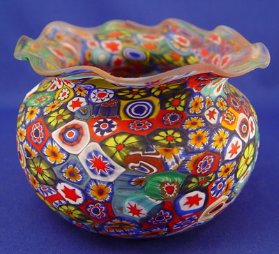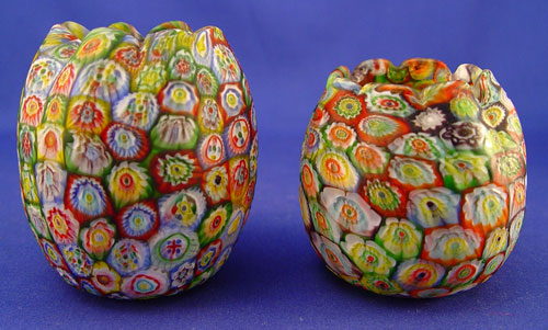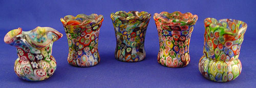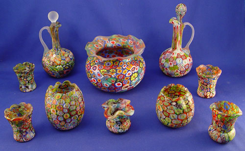 10 PIECE COLLECTION ITALIAN MILLIFIORI GLASS: 2 cruets, one with satin glass stopper to match handle. 7 1/2'' and 8'' high. Large ruffle top bowl, 4 1/4'' high x 6'' dia.. Five toothpick holders and 2 rose bowls, 3 and 3 1/4'' high.