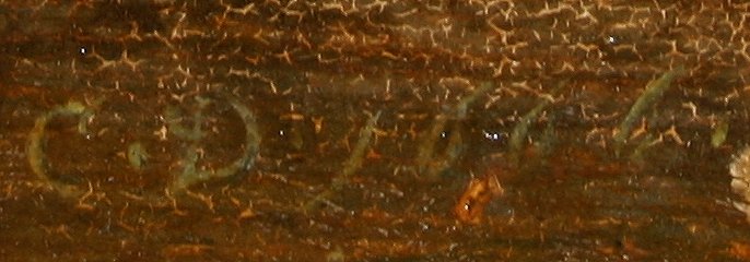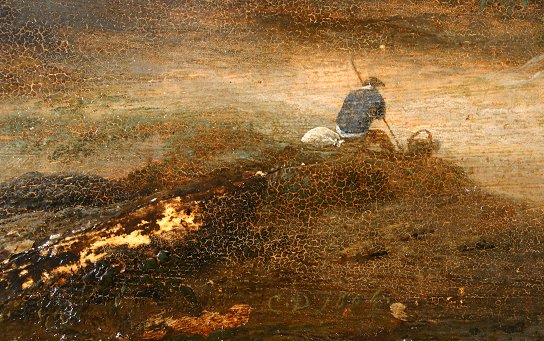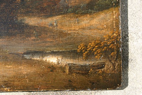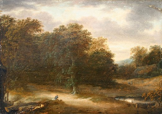 DECKER, Cornelis, (Dutch, 1600-1678): Landscape with Figures, Oil/Oak Panel, 11'' x 15 1/2'', monogrammed CD, dated 1666, unframed. Older repair to lower left and upper right corners with some inpaint. Est. $4000/6000**
