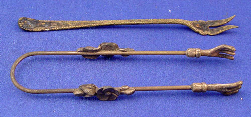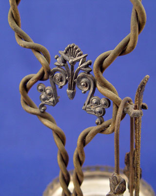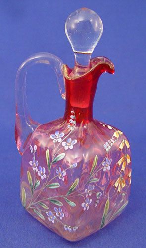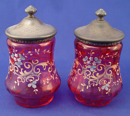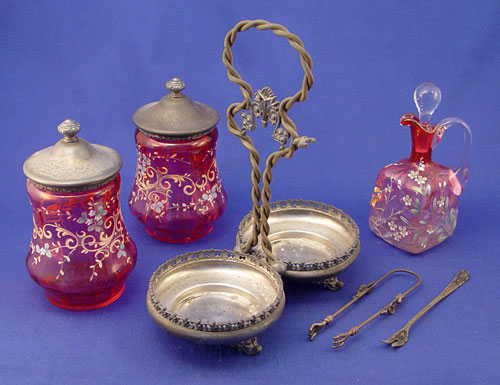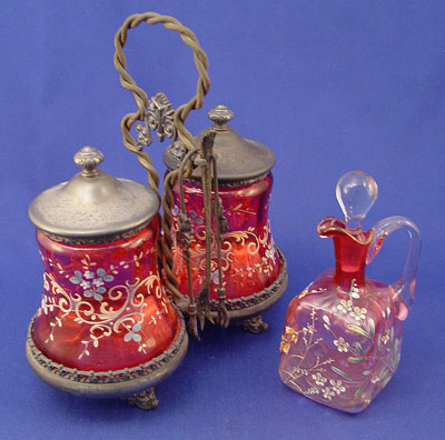 ENAMEL DECORATED VICTORIAN CRANBERRY GLASS: 1) Cruet with applied clear handle and stopper, 6 1/4'' high. 2) Matched pair of pickle castors in victorian silverplated stand with tongs. Jars are 4 1/2'' high. Stand is 9 3/4'' high x 8 1/2'' wide.