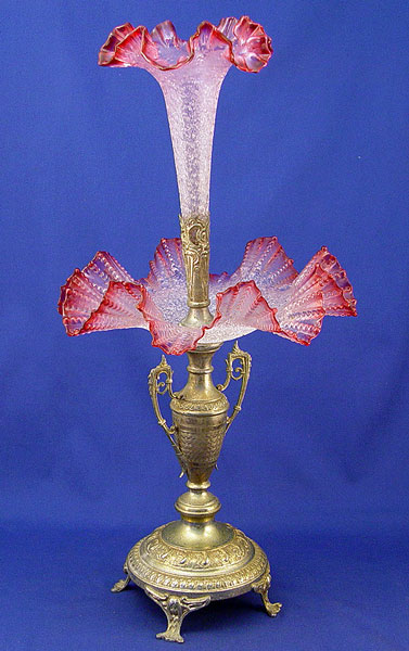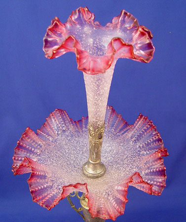 19th C CRANBERRY GLASS EPERGNE VASE: Ruffle rim bowl and trumpet vase, silverplate mounted. The bowl is 10 1/2'' dia., the piece is 21''h.