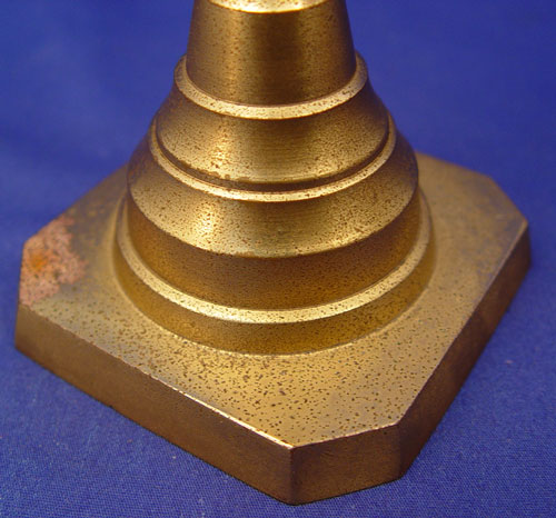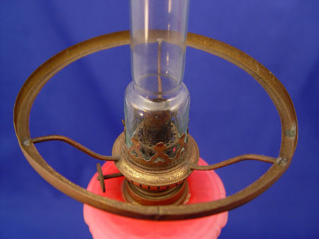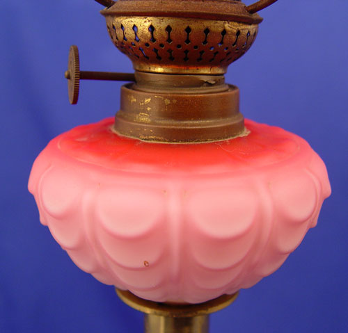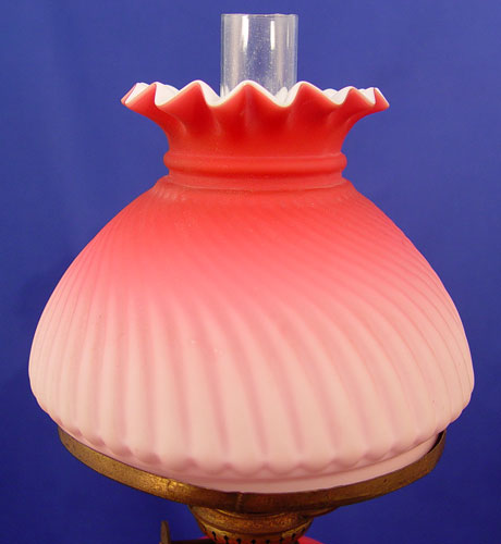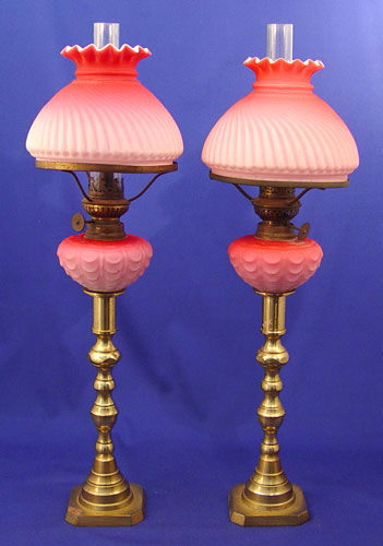 PAIR PINK SATIN GLASS PEG OIL LAMPS WITH SHADES: Removable ''peg'' lamps fit into most candlesticks. These sticks are 10'' tall brass. The swirl glass shades have a 5'' fitter rim. The lamps are complete with glass chimneys. 21''h overall.