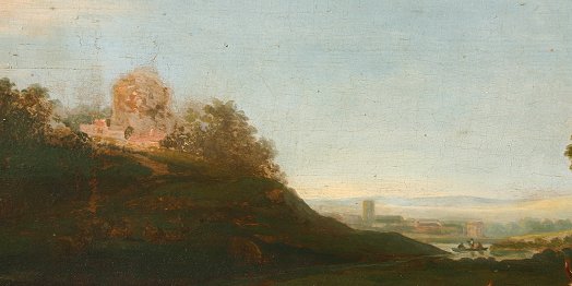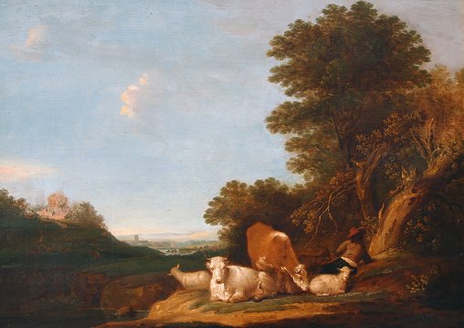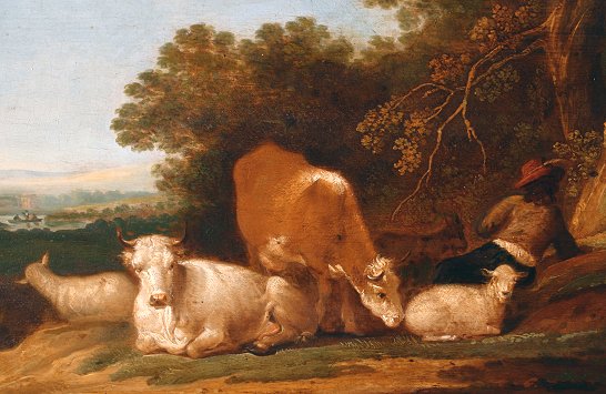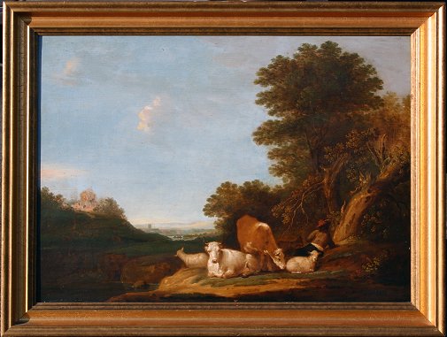 19TH C OIL/OAK PANEL OF COWS, SHEEP, GOATS & SHEPHERD IN LANDSCAPE: 19 1/2'' x 27'', no visible signature, gilt wood frame with wear, 23 1/2'' x 31''. Several areas of in-paint and over cleaning, glued repair to panel not visible on front.