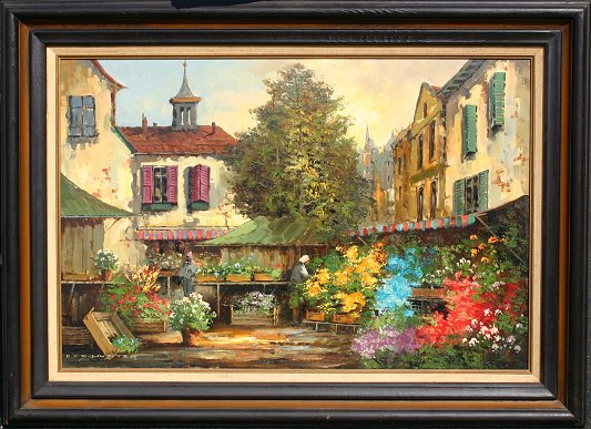 SCHUSTER, O. C., (European, 20th C): European Flower Market, Oil/C, 24'' x 36'', signed, signed and titled verso, encased in wooden frame, 32'' x 44''.