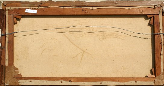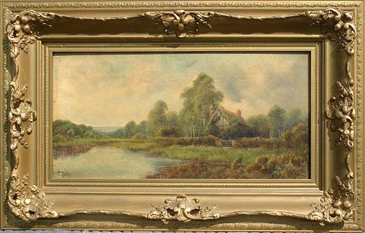 LATE 19th C COUNTRY LANDSCAPE WITH COTTAGE ON A STREAM: Oil/C, 12'' x 24'', signed E. Cole?, encased in over painted period gilded gesso frame, 21'' x 33''. Cracklure throughout, several minor spots of paint flecks, needs cleaning.