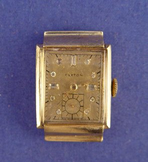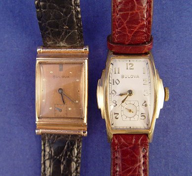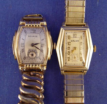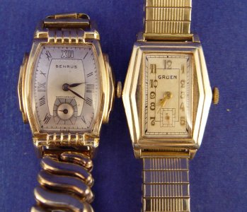 ESTATE LOT OF 5 VINTAGE WATCHES: 1) 10k gold filled man's Gruen wristwatch in running order. Gold-tone dial with applied Arabic markers. Some foxing on dial. Mechanical movement #1-36304 582, seven jewel adjusted. Gruen Guildite base metal case with 10k gold filled bezel, #2353430, etched design to sides. Glass crystal, Speidel stretch band, Circa: 1930's. 2) 14k rose gold filled man's Bulova wristwatch. 17 jewel mechanical movement. Crown is missing - watch is not running. Fancy hooded lugs. Serial #3045C28, monogrammed L.C. Fish Jr. Rose-tone dial with missing markers, subsidiary dial. Hand crafted Alligator grain leather strap. Circa: 1940's 3) Deco gold filled man's Benrus wristwatch in running order. Two-tone silver-tone dial with painted Roman markers, subsidiary dial. Some foxing on dial. Mechanical 9 jewel Croton Watch Co movement, E36 731. Speidel stretch band. Circa: 1930's 4) 10K gold filled man's Bulova wristwatch in running order. Case #00369279, Bulova stem, ivory colored dia