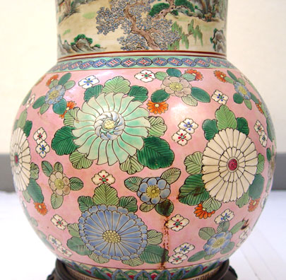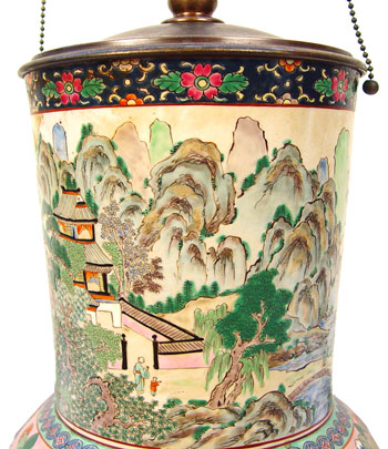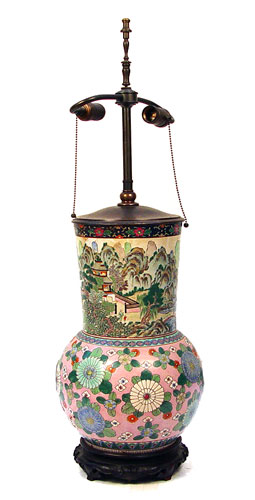 POLYCHROME CHINESE CERAMIC LAMP: From large 16'' vase, the lamp is 32 1/2''h., 10'' dia. at the widest.