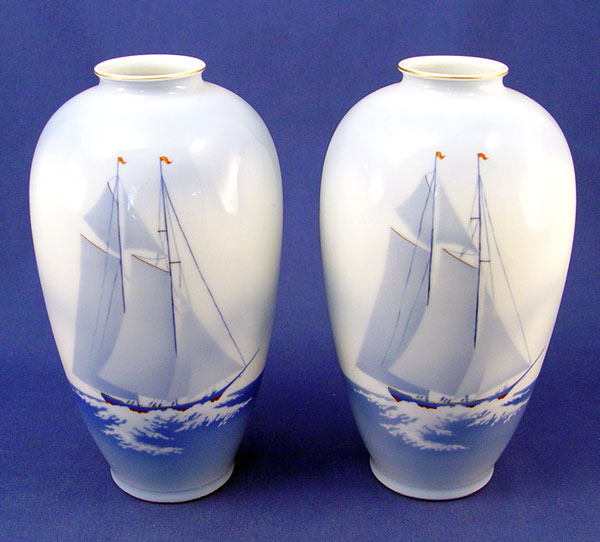 PAIR JAPANESE FUKAGAWA PORCELAIN VASES: Marked with the blue mountain, 8 1/2'' tall.