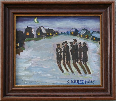 KARCZMAR, Simon, (Russian, 20th C.): Group of Figures Gathered Outside of Town in the Moonlight, Oil/B, 6'' x 7'', signed, framed, 8'' x 9''.