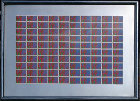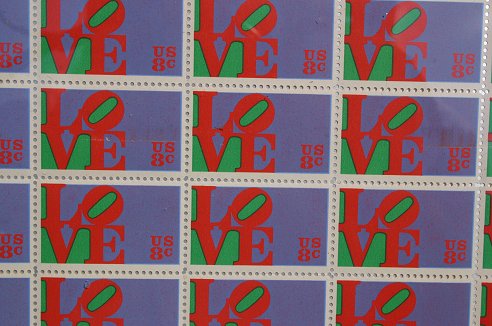 ROBERT INDIANA LOVE STAMP SHEET ERROR: Two fifty count sets, one containing the color error, framed 14'' x 20''. Faint abrasion visible.