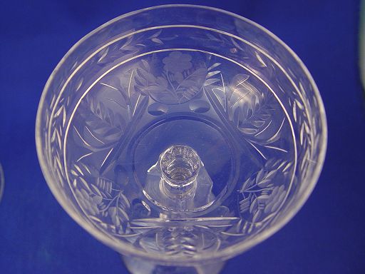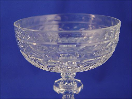 SET OF 11 ETCHED CRYSTAL CHAMPAGNE STEMS: Possibly Libbey Rock Sharpe, notched stems, etched bowl, 6 1/4''h.