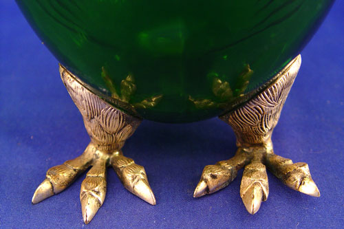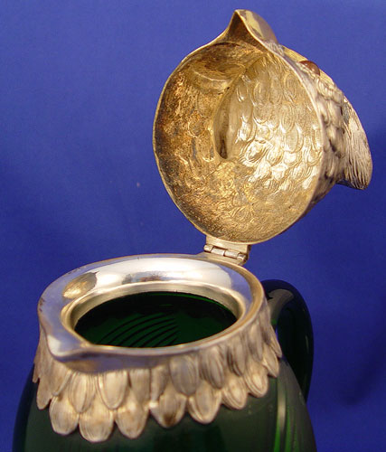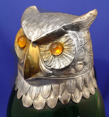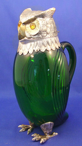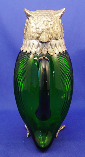GREEN GLASS OWL JUG WITH SILVERPLATE HEAD & FEET: Molded green glass with amber glass eyes. 11'' tall. Marked ''Spain'' and ''M'' in rectangle. Note isolated spots of silverplate worn to base metal.