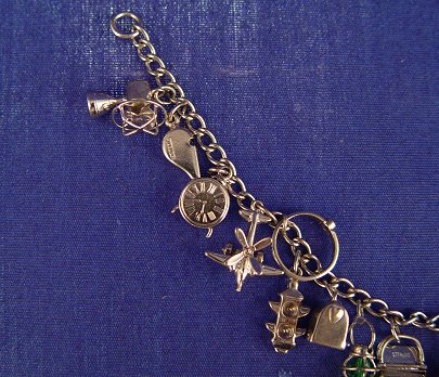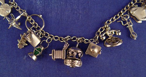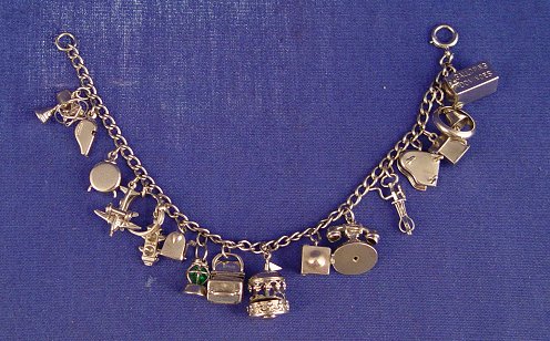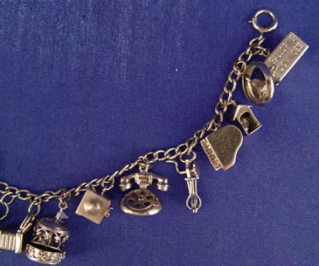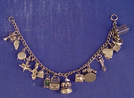 VINTAGE STERLING CHARM BRACELET: 17 charms total. The 9 mechanical include a carousel, fan with blades, beater mixer, Negro Jack In The Box, accordion mail box, piano, airplane. 7'' long. .90 troy ounces.