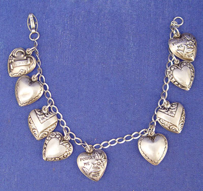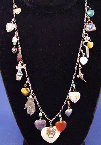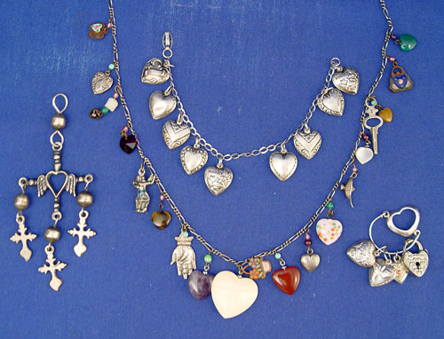 STERLING HEART CHARMS & CHARM NECKLACE: Charming collection to include 1) Victorian sterling charm bracelet with 9 sterling hearts, 6 1/2'' long. 2) Sterling charm holder with 3 puffy heart charms and a heart lock. 3) A 4 1/2'' long silver pendant 4) Link chain necklace with 17 charms, mostly hearts, including ivory, sterling, carved stone hearts, and an enameled purse.