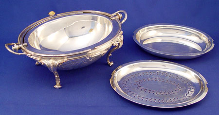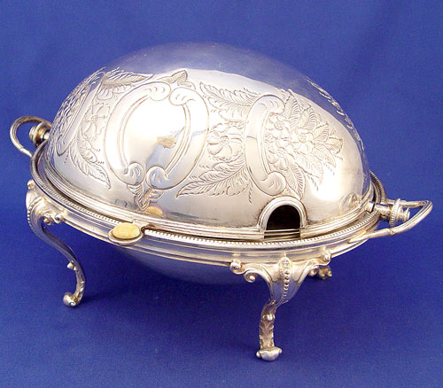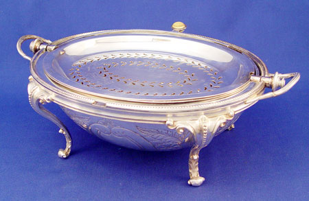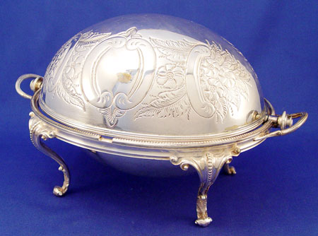 VICTORIAN FOOTED SILVERPLATE REVOLVING BREAKFAST DISH: Two removable trays for warming and serving breakfast. Top revolves to open. Ivory button on handle. Unmarked. Note minor area of flake. 8 1/2'' high X 13 1/2 inches oval.