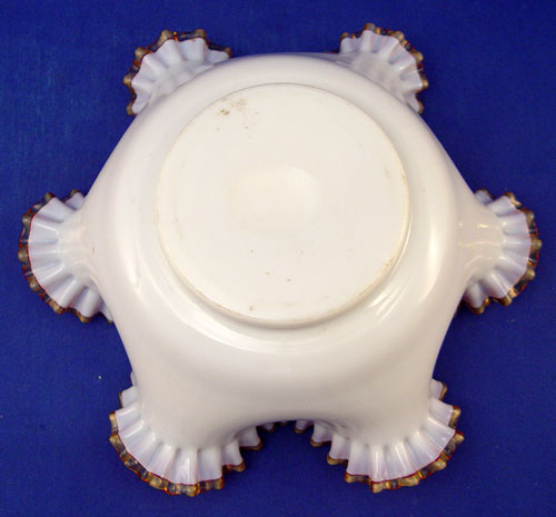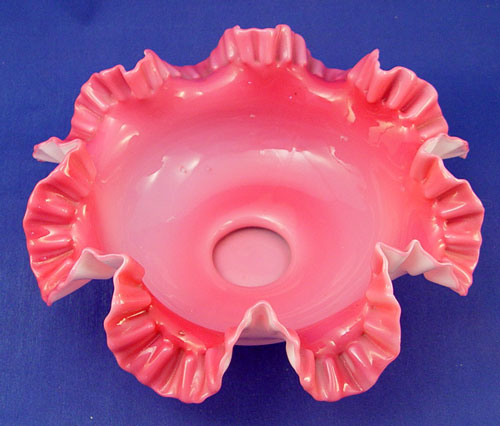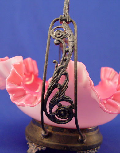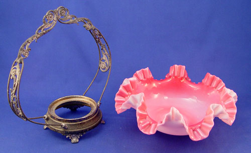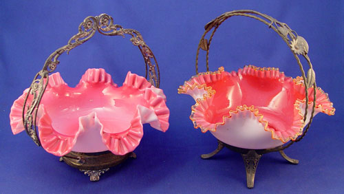 TWO ART GLASS BRIDES BASKETS: Both pink and layered with white. One has amber rim. Each is 10 1/2'' dia. Silverplate shows some wear.