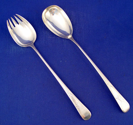 GEORGIAN SILVER SERVING SPOON AND FORK: London, 1786, maker George Smith?, 11 3/4'' and 12'' long. No monogram. Approx. 6.1 oz.