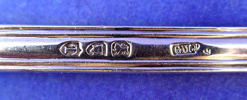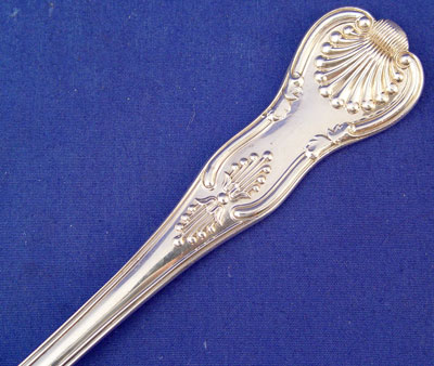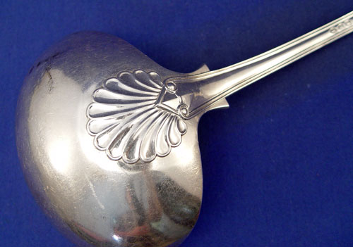 LARGE ENGLISH STERLING LADLE: Shell design, hallmarks indicate 1894, maker GMJ George Maudley Jackson. Monogrammed. 13 1/8'' long. Approx. 11.4 troy oz.