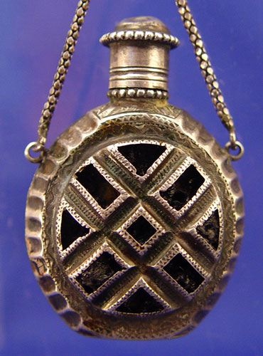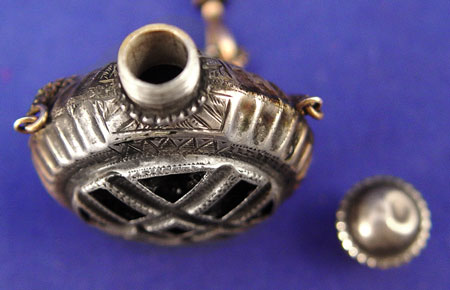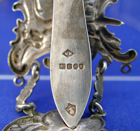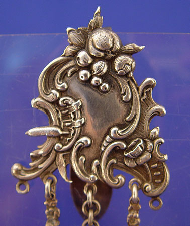 PRE 1897 CHATELAINE WITH VINAIGRETTE BOTTLE: Hallmarks indicates London import by William Mooring, 1897, also bears the Munich, Germany angel. Actual date unknown. 9''l. 0verall.