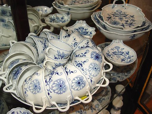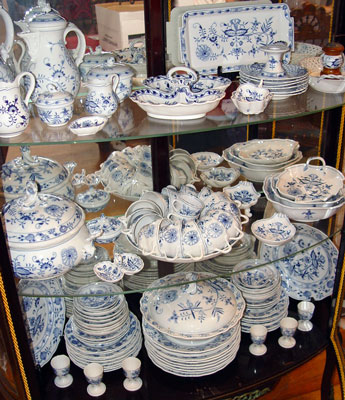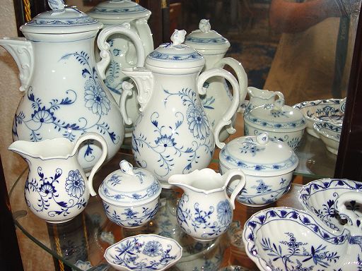 HUGE COLLECTION OF MEISSEN ''BLUE ONION'' CHINA: 92 pieces to include 12 dinner plates (10'' dia.), 7 plates (8''), 9 plates (7 1/2''), 14 teacups, 12 saucer bowls, 3 demitasse cups, 3 saucers, 2 butter pats, 2 cream pitchers, 2 covered sugar, 6 egg cups, chamber stick, 11'' tray, coffee pot, teapot, reticulated basket (10 1/4''), divided dish with handle, low serving bowl (11'') 2 square serving bowls, pepper mill, leaf dish, 2 large covered servers, and 7 assorted small tidbit dishes. All with the cross sword mark. Also in this great lot are 6 Hutschenreuther bread plates and 6 reticulated dessert plates with the oval Meissen mark. Est. $800/1200**