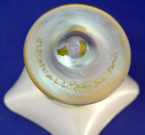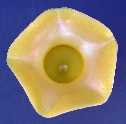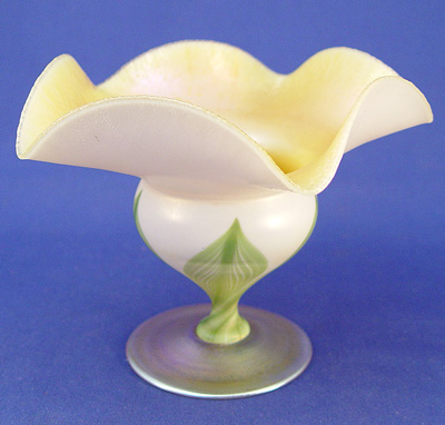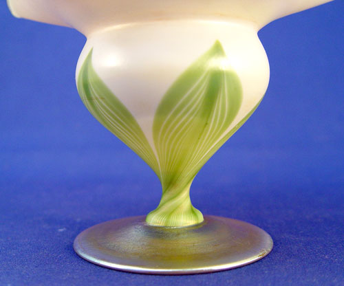 TIFFANY FAVRILE ART GLASS PEDESTAL COMPOTE: Flower form, pulled feather or leaf design, signed ''1525 4341 L.C. Tiffany Inc. Favrile''. 4 3/4''h., 6'' dia.