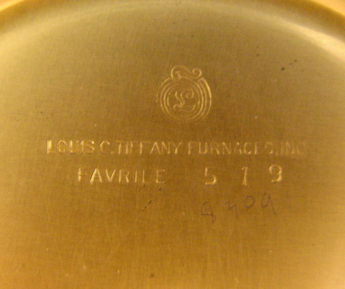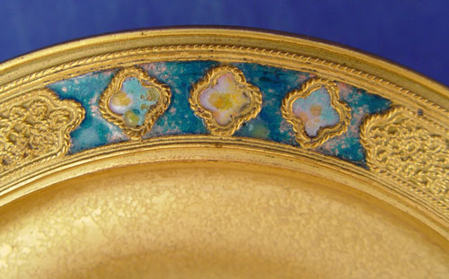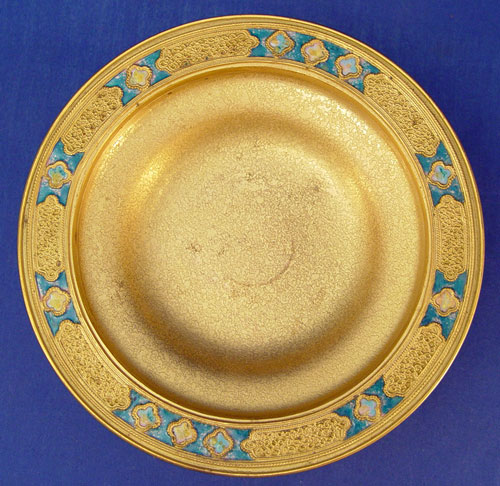 TIFFANY FURNACES BLUE ENAMELED GILT BRONZE COMPOTE: Stamped ''Louis Tiffany Furnaces Inc. Favrile 519''. 7 7/8'' dia. 2 3/4'' high.