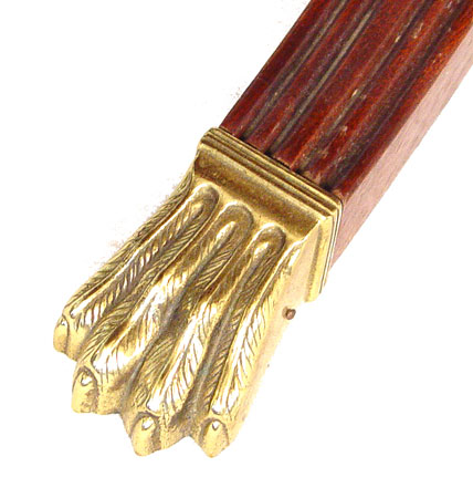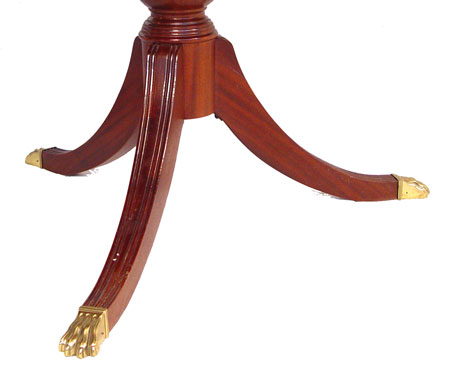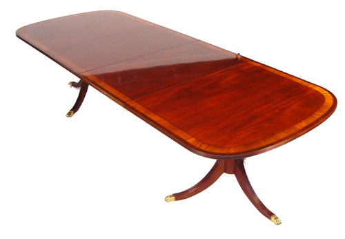 ETHAN ALLEN BANDED MAHOGANY DINING TABLE FROM THE 18TH C MAHOGANY LINE: Table with bands of mahogany and burled wood. Double pedestal base, splayed legs ending in brass caps. 46''w. x 72''l. (without leaves), two 24'' leaves and table pads.
